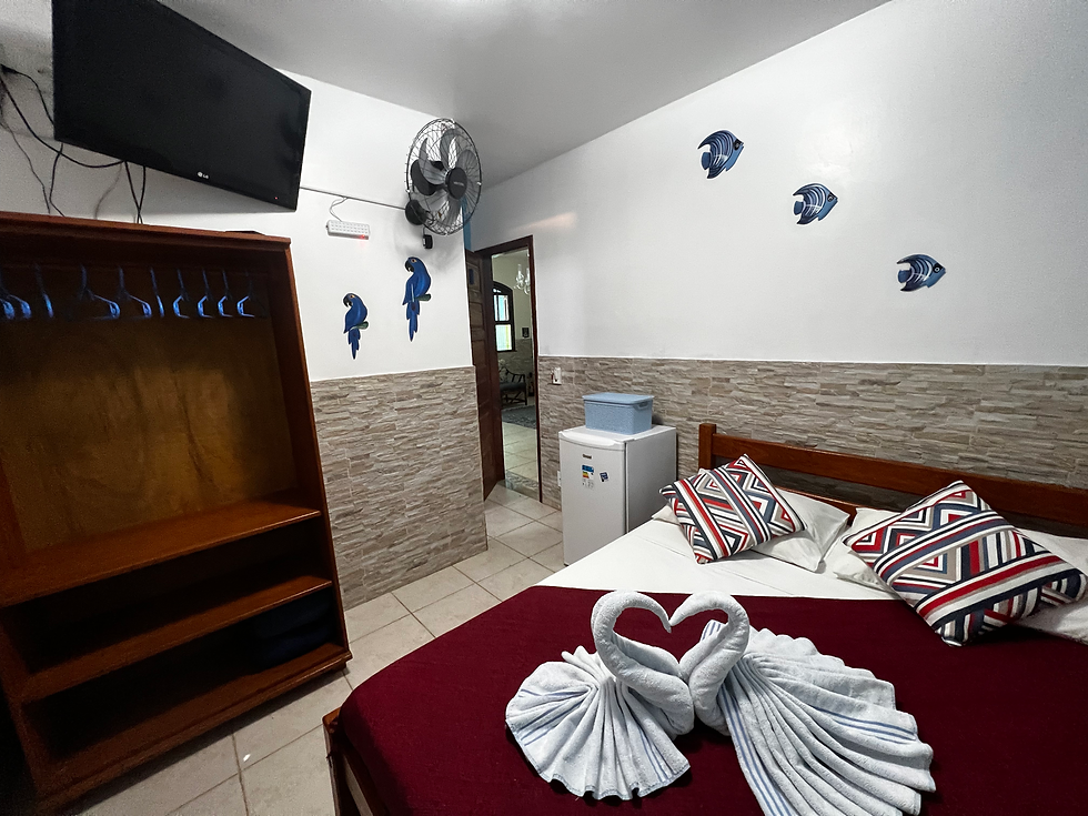 Todas as suítes aqui na Azul del Mar contam com banheiro privativo, chuveiro aquecido, Ar condicionado, Tv via satélite, frigobar e wi fi. Acomodam de 2 a 5 pessoas (com uso de camas extras). Os quartos estão sujeitos a disponibilidade no momento da reserva.
